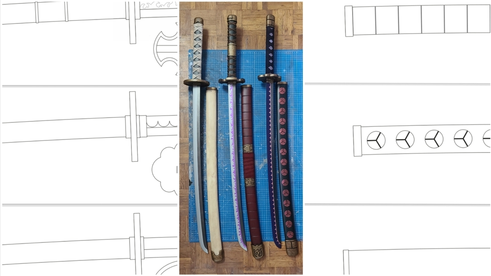 It include the blueprint for the blades and sheaths of: Wado ichimonji, Sandai kitetsu and Shusui.